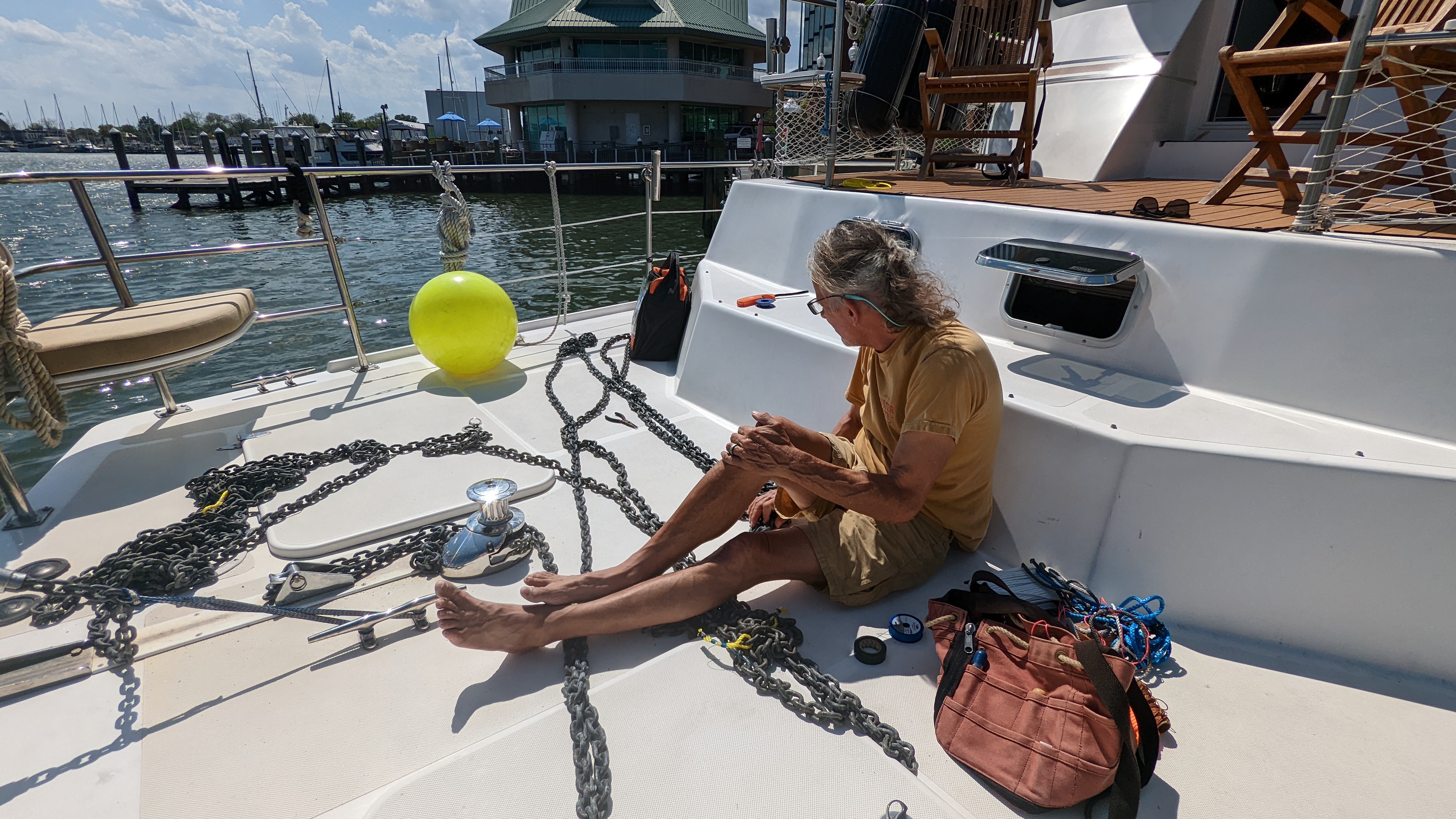 We enter. As we're heading slowing forward we notice we are not being pushed to the right at all but rather to the left. Towards the danger! And within moments, we had no room to turn or maneuver. We cleared the big, shiny boat but within a few more moments we were up against another sailboat's stern (Note: it was in the slip just beyond the big one, but it, too, was also 10 feet longer than the slip, otherwise we'd have just been on the pilings). One of its davits got caught in our rails and got twisted. Russ managed to push us off. By then the dock hands realized we were in distress and ran to an empty slip just ahead of us. Once Russ freed us we bumped forward and could twist ourselves around a piling and get into that empty slip.